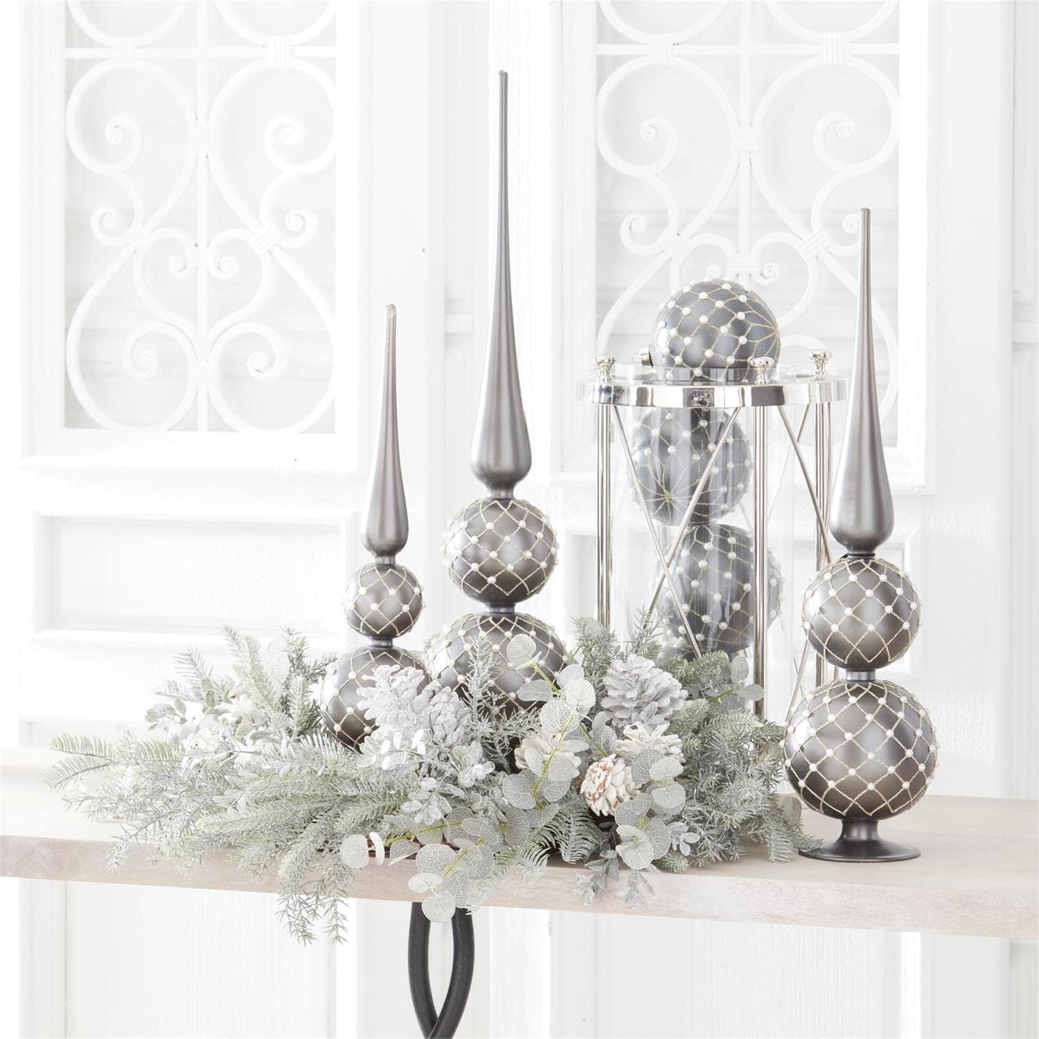 Add a touch of elegance to your holiday décor with this matte gray glass ornament, adorned with sparkling gold diamond glitter and delicate pearls. Measuring 4.75 inches in diameter, it offers a sophisticated shimmer that complements any Christmas tree style. Hang it proudly to create a festive atmosphere filled with warmth and charm.