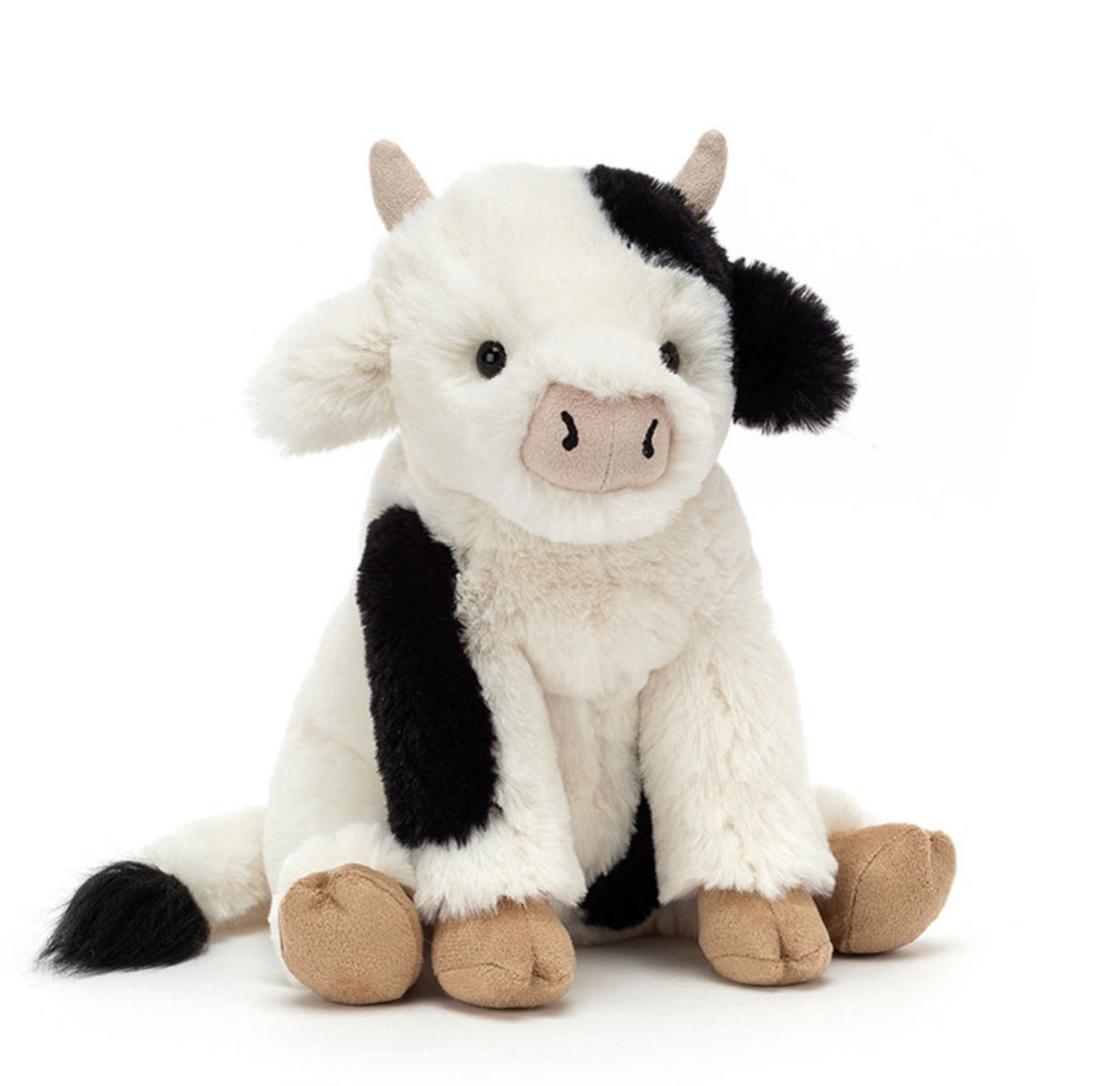 Carey Calf is a divine dollop of cream, with bold black patches of supersoft fur. Lollopy-gentle with suedey hooves, horns and snoot, this calming cow gives very cosy cuddles. With a tassel tail and neat wee ears, Carey's a dairy delight.