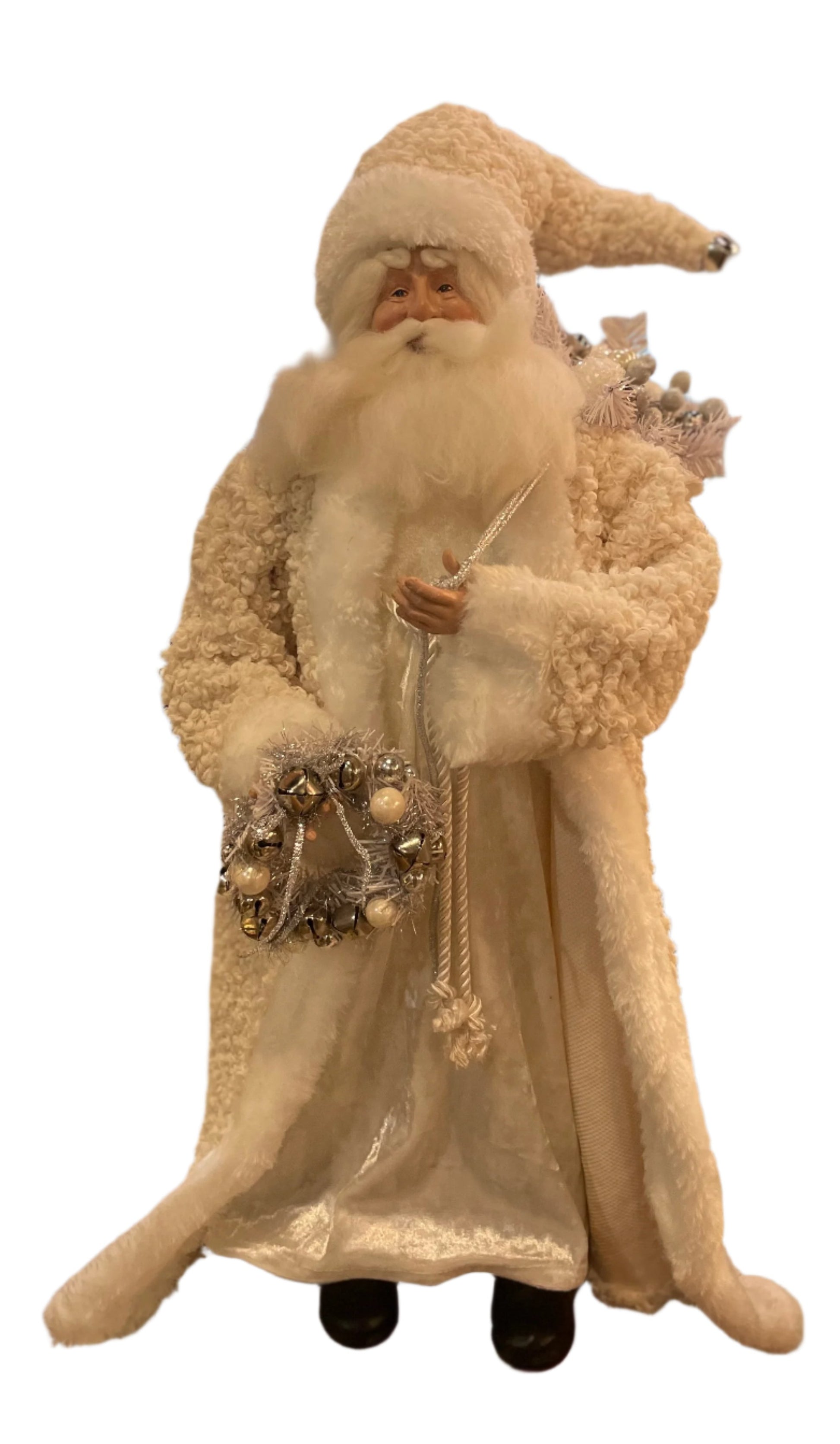 26 Inch Cream Fringe Coat Santa with Wreath & Sack