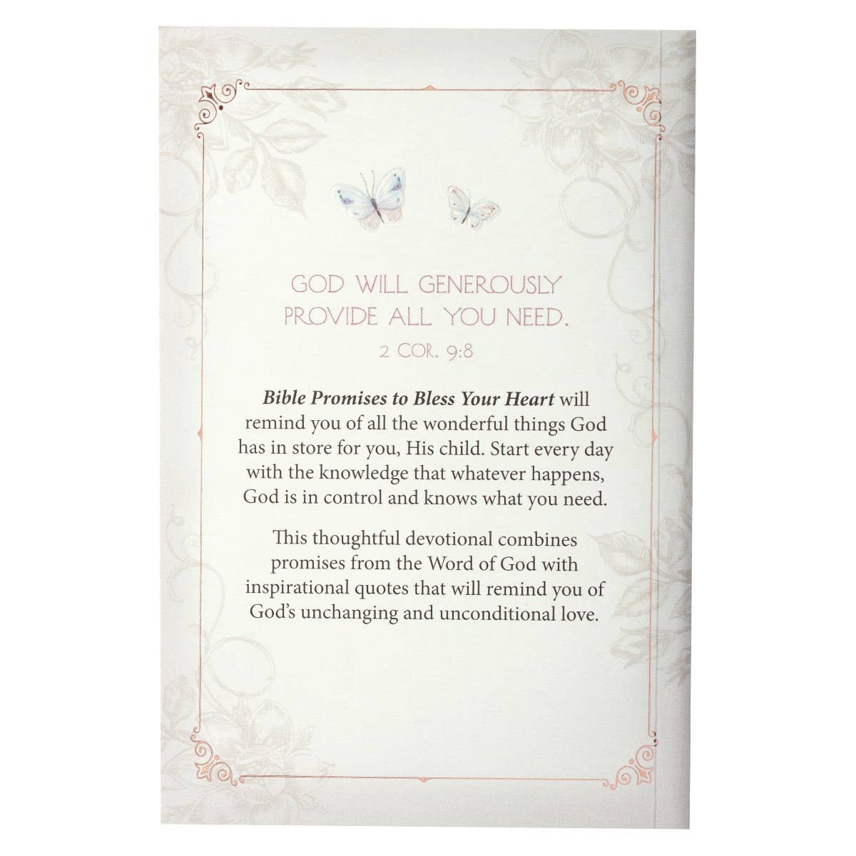 The back cover features two fluttering butterflies above a Scripture verse that sets the theme for the devotional. The bird motif is repeated on the back cover, and the content is introduced by a verse that acts as the theme for the devotional.
