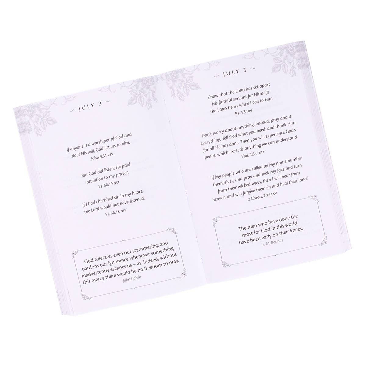 The taupe-colored softcover of the small devotional is decorated with a simple gold-foiled frame with delicate corner scroll designs. A luscious bouquet is spot-varnished and set at the bottom of the frame. The title is presented in thin black block letters accented with gold-foiled scripted letters.