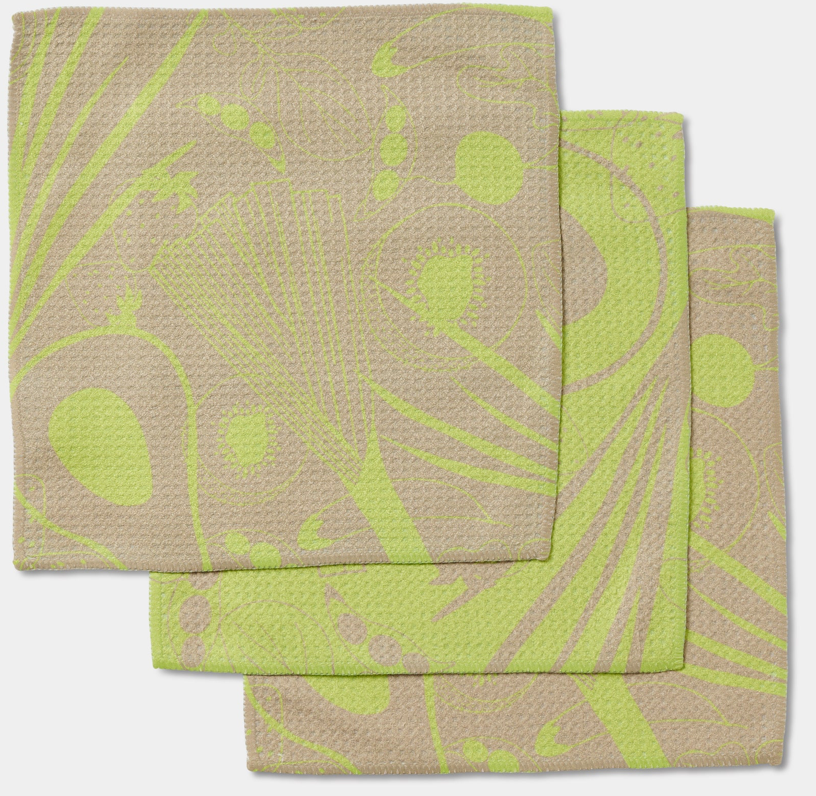Geometry dishcloths provide super cleaning and next-level absorbency when drying dishes and surfaces! Dishcloth Set - 3 pack | 10" x 10" | Made from recycled polyester | Weight: 320 g | Single-sided print | Hang loop | Waffle weave construction | Quick-drying